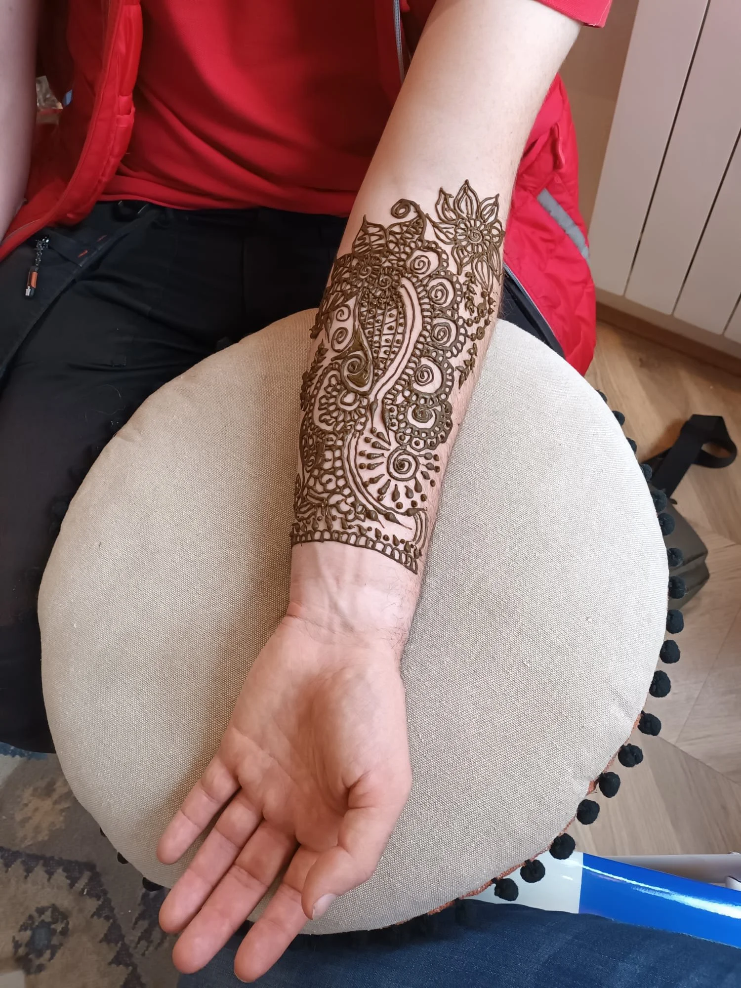 She applies the henna using a cone to apply the paste, drawing intricate patterns on your skin. As the paste dries, the henna turns dark brown and hardens.